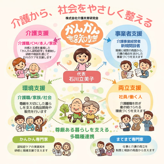 - 介護支援(介護職・個人)・・共感と五感を重視した「かんかん認知症学」を創始し研修や相談を通じて日々のケアを支援します